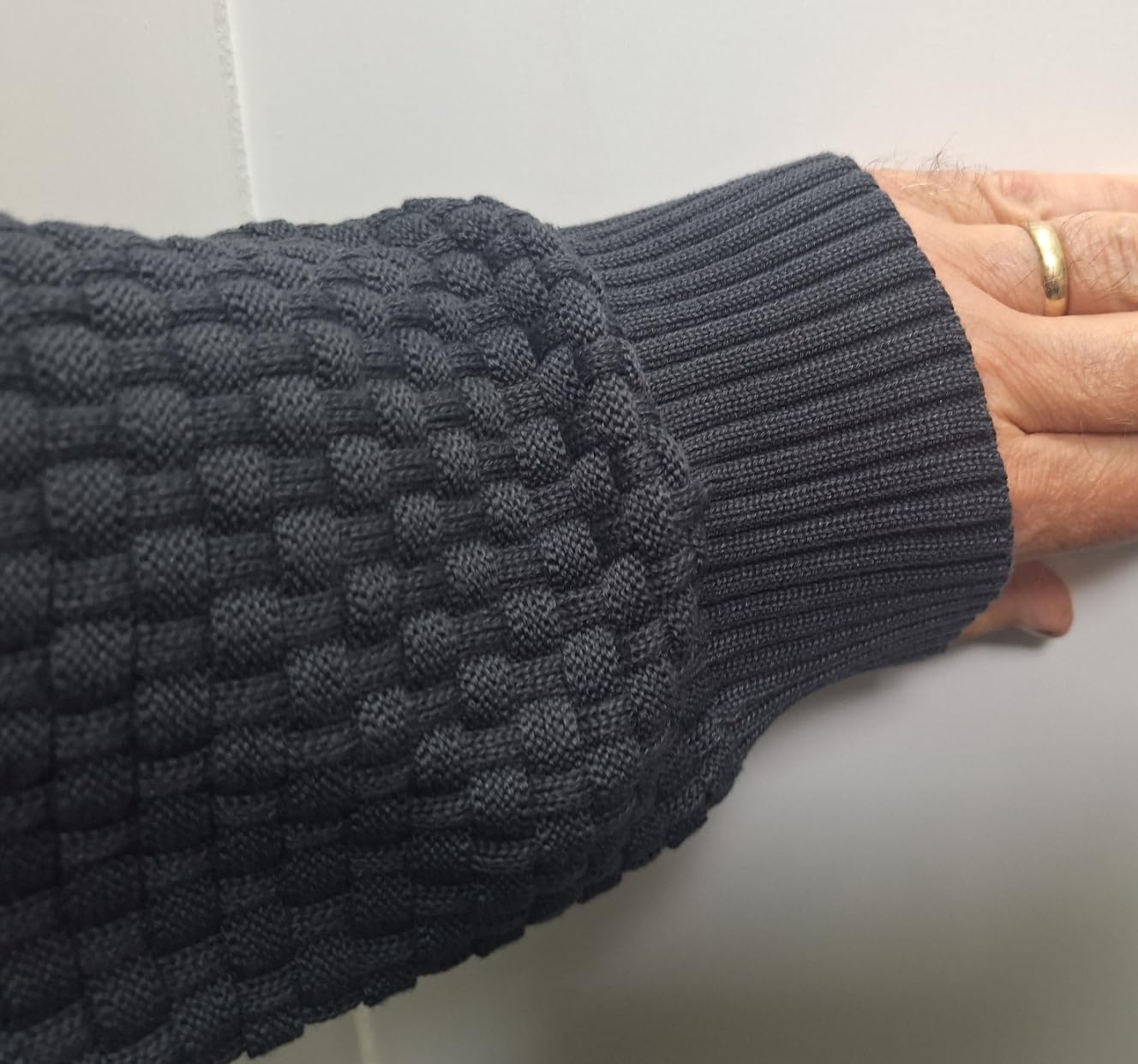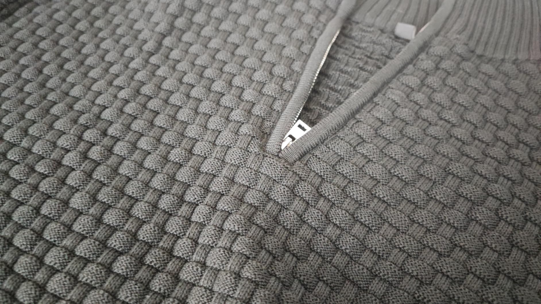 Very comfortable against the skin and not itchy at all. The knit has a nice weight to it and the zip detail gives it a clean smart look.